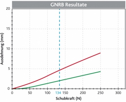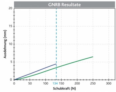 Gute Entwicklung der Plastik. Die parallelen Kurven zeigen einen guten Widerstand der Bandplastik gegen die angepassten Schübe, ohne Verzögerungen. Die Bandplastik wird als funktional eingestuft und die Kurven sollten idealerweise bis zum Abschluss der Bandheilung parallel bleiben.
