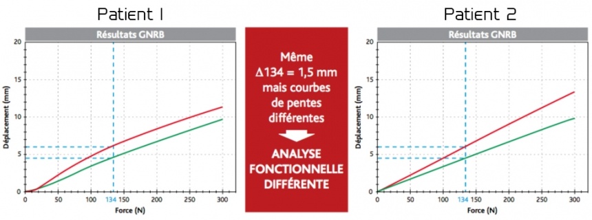 Sur les deux graphiques ci-dessus, à 134 N, le GNRB a enregistré un différentiel de déplacement similaire pour les deux patients (1,5 mm). Si nous suivons la méthode d'analyse initiale (l’analyse statique), nous en déduisons que les deux patients ne souffrent pas de lésions ligamentaires. Hors, pour le patient 2, ce n'est pas le cas. Ce dernier souffre d'une instabilité. Le GNRB montre clairement grâce à ses facettes d'innovation et de précision qu’un diagnostic supplémentaire peut-être effectué : l'analyse des pentes des courbes de compliance.