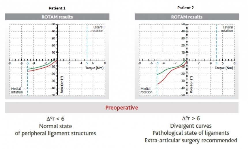 Cet exemple indique l'efficacité d’effectuer des tests dynamiques par rapport aux tests statiques. En prenant en compte le différentiel des pentes de courbes de compliance et le différentiel de rotation, nous obtenons des résultats beaucoup plus précis sur les structures ligamentaires périphériques du genou.
